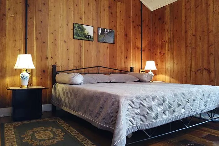 The Explorer Suite gives the cosy feel of a mountain log cabin with wooden wall panelling ...