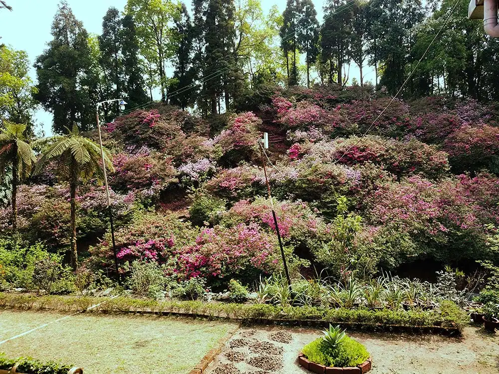 The scenery is breathtakingly absorbing. The view to the North takes in majestic pine trees. As you turn East, you enter the peaceful lawn with amazing sights of Siliguri lights at night. Turning South you gaze at bougainvillea, a hill covered with azalea in season, and moving Westward brings views of more flora and fauna extending to the Goomtee tea factory. Its fascinating to observe the changing hues from the majestic morning sunrise to the evening. It can be so still and silent that you can actually hear yourself thinking amidst the lasting peace and solitude.