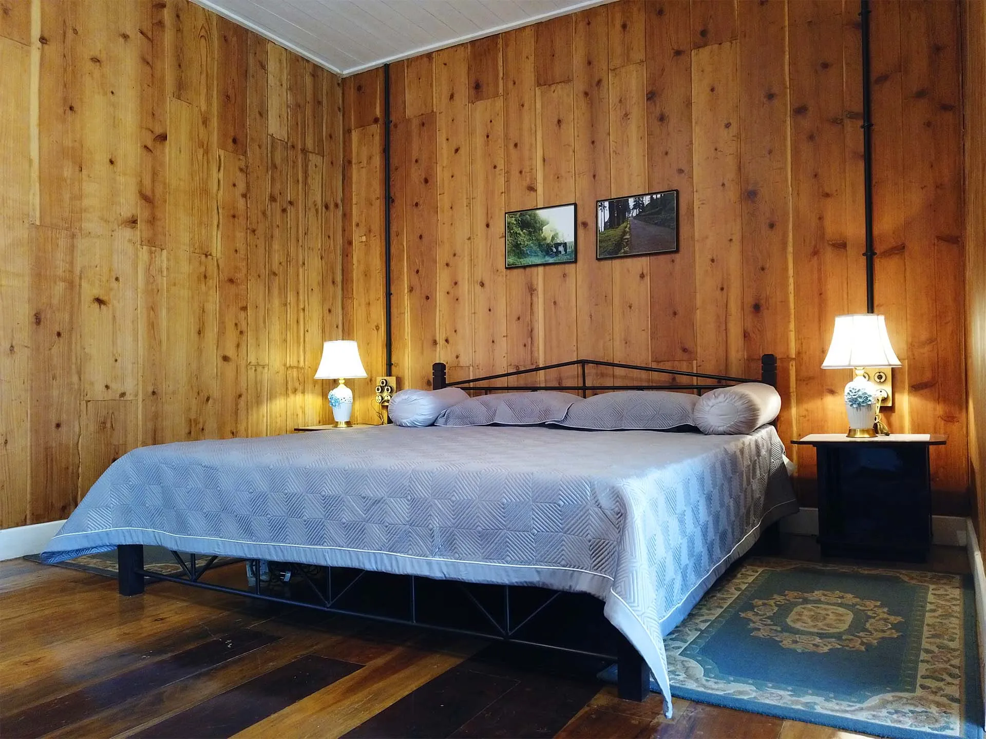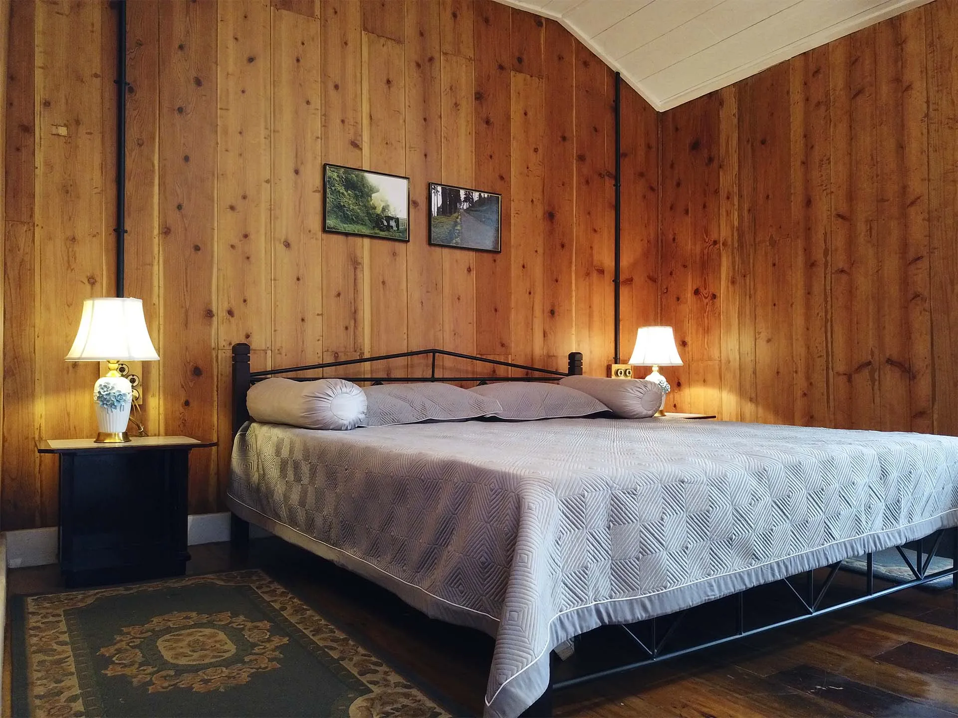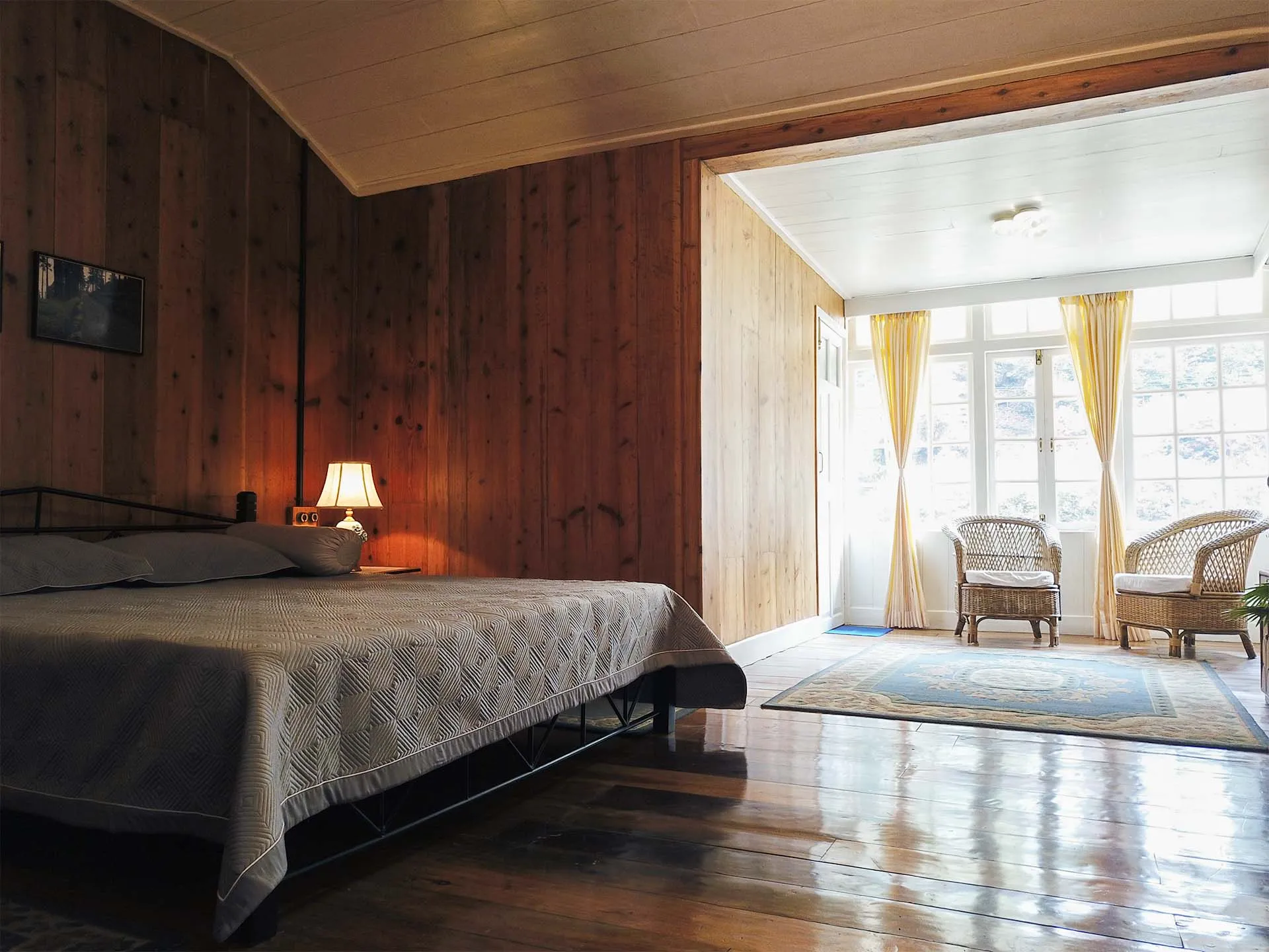 The Explorer Suite gives the cosy feel of a mountain log cabin with wooden wall panelling and hardwood floors. Like the other rooms, the Explorer Suite too offers picture windows and a splendid view of the hills which are resplendent when the Azalea flower is in bloom. This room does not open out into the lawn, but has a comfortable seating area outside the door.